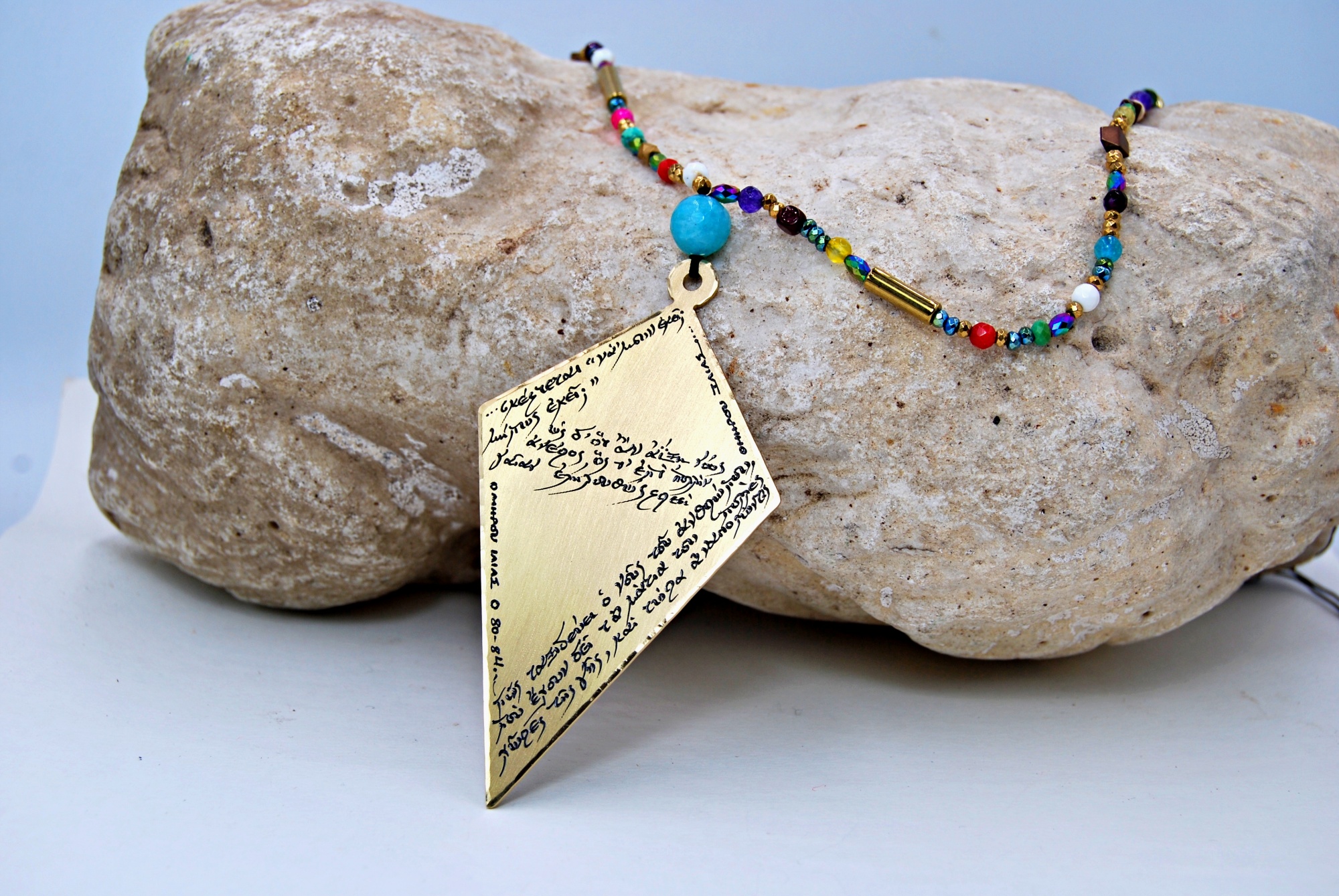 Εντυπωσιακό κολιέ με ποικιλία πολύχρωμων πετρών και χαντρών από αιματίτη,χαολίτη, αμαζονίτη, αμέθυστο, κοράλλια.